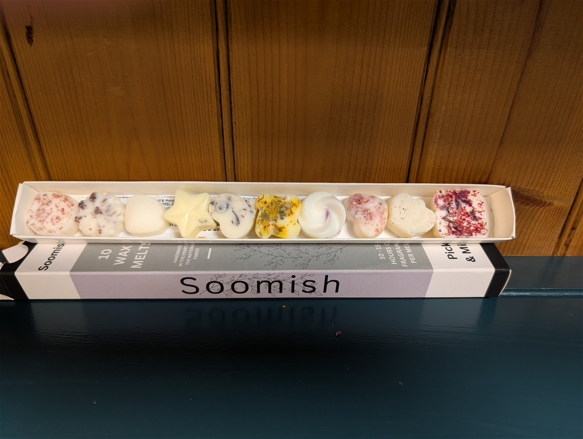 A flower arrangement in a hatbox.with a set of 10 gorgeous smelling wax melts.