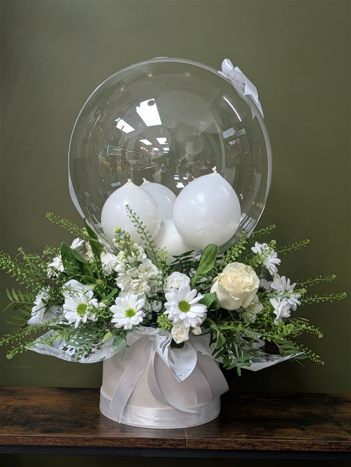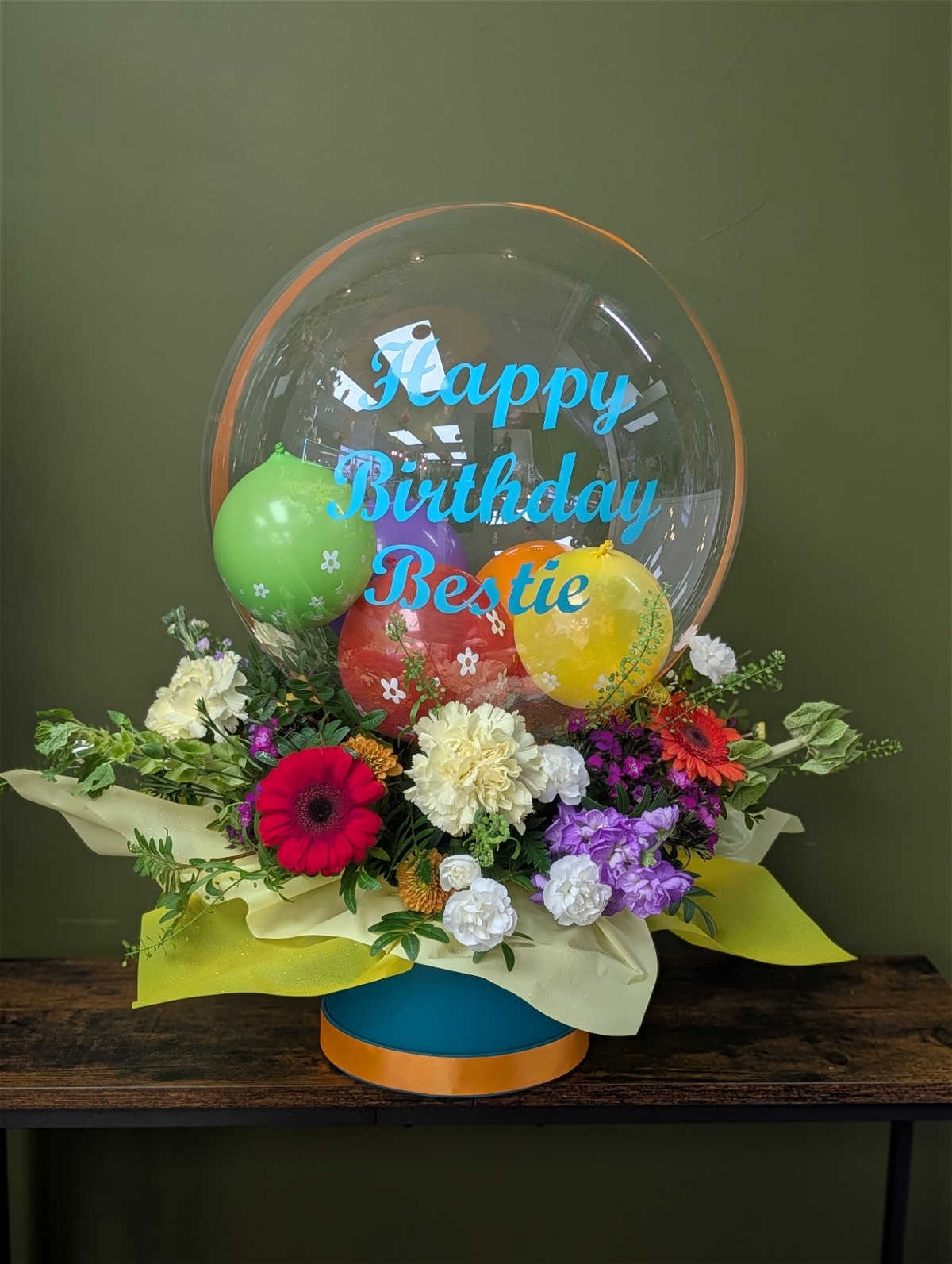 Air filled balloon with little balloons inside. Surrounded with a lush mix of fresh flowers—a beautiful twist on classic gifting.