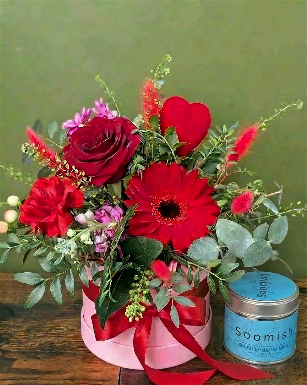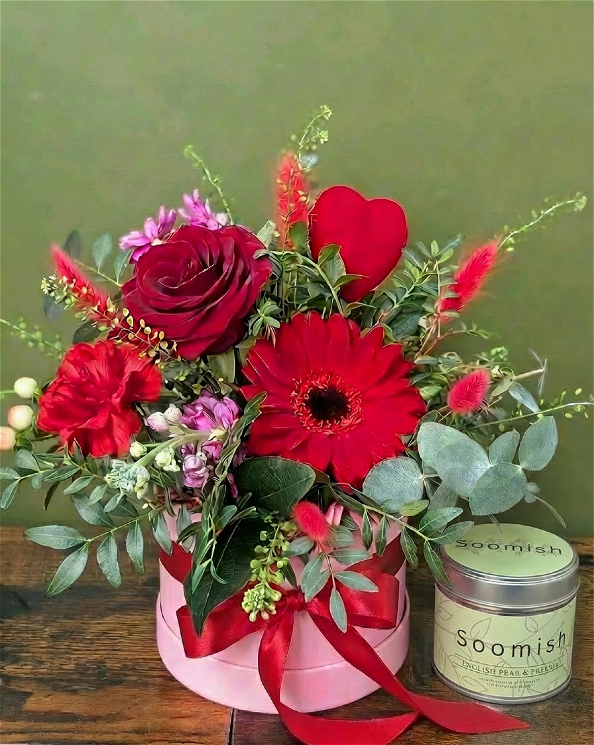 Our Sweetheart Floral Hatbox and candle set is the perfect Valentine’s gesture, designed to celebrate love in the most beautiful way. Featuring rich red and pink blooms, soft seasonal flowers and textured foliage, this romantic arrangement is presented in a pretty hatbox, finished with a velvet heart and delicate ribbon detailing.
