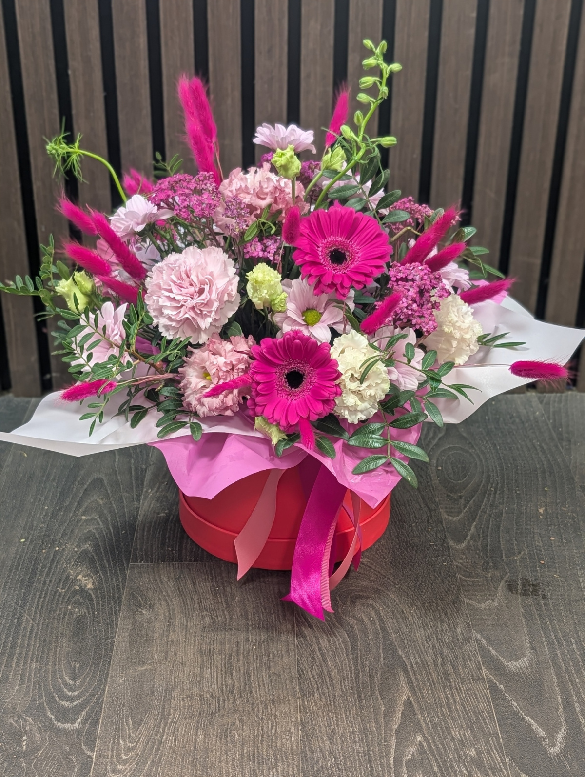 Will will try our best to use the flower in the picture but if we can't due to different stock or the season, then we will use different flowers but keep it to the girly pink theme.