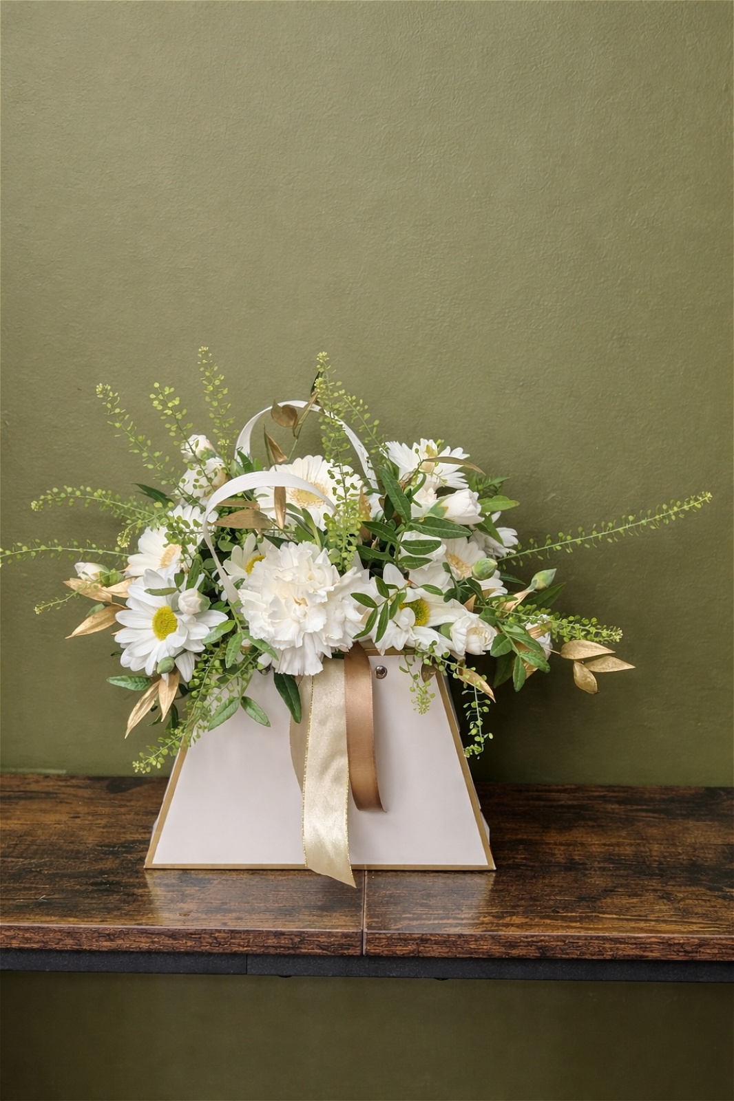 A beautiful floral “handbag” filled with fresh seasonal blooms.