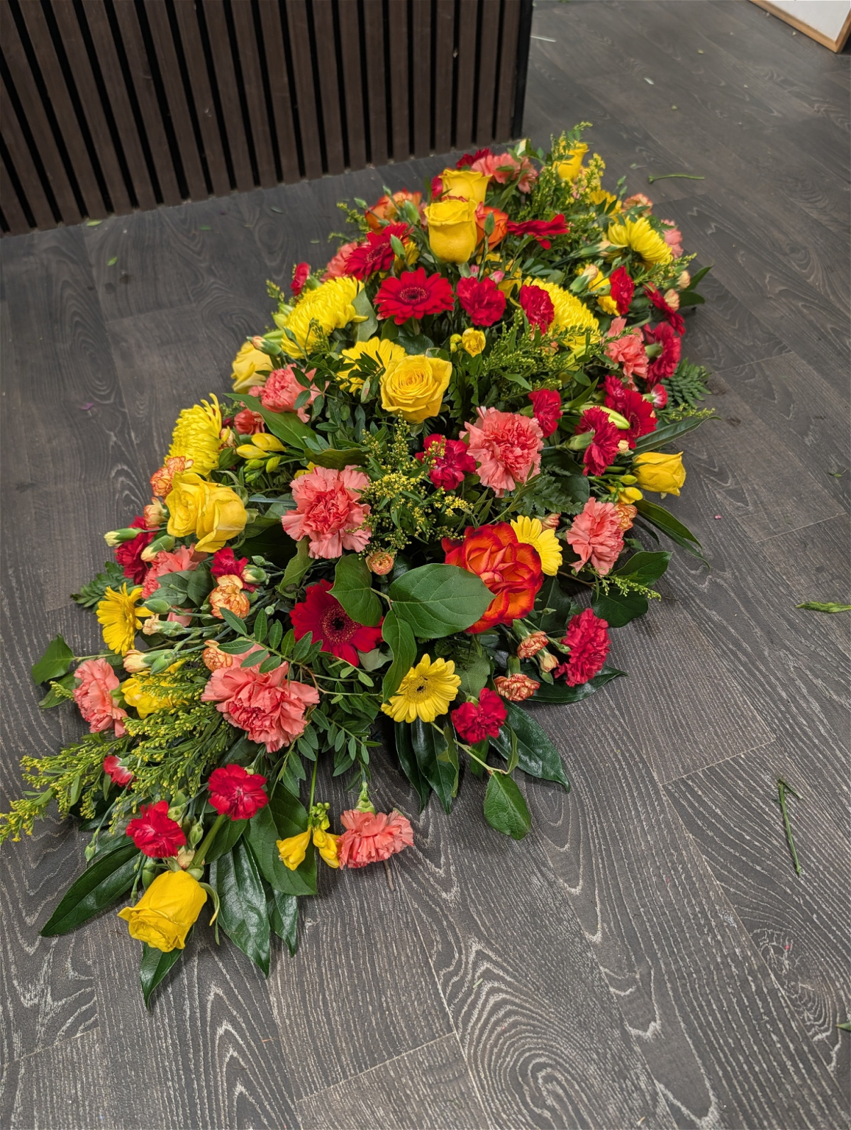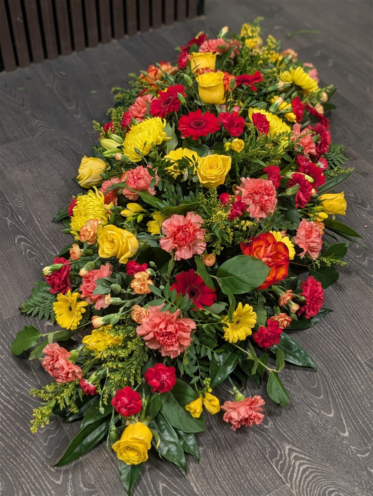 4ft coffin spray with a mix of carnations, roses, germinis and other seasonal flowers.